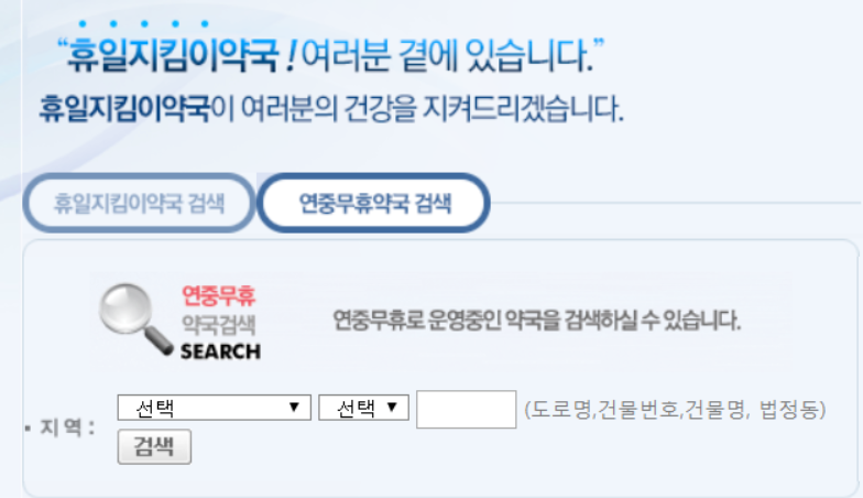 여기 응급의료포털 사이트에서도 휴일 지킴이 약국과 비슷하게 지역기반으로 휴일에 여는 약국 및 병원 검색이 바로 가능합니다.