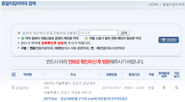 저는 집근처인 강남에 있는 토요일 약국 영업시간 찾기를 시도했습니다. 휴일지킴이 약국 홈페이지에서 지역 기반으로 검색을 하면 바로 토요일 진료하는 병원 및 토요일 약국 여는 곳의 영업시간이 쭉 나열됩니다.